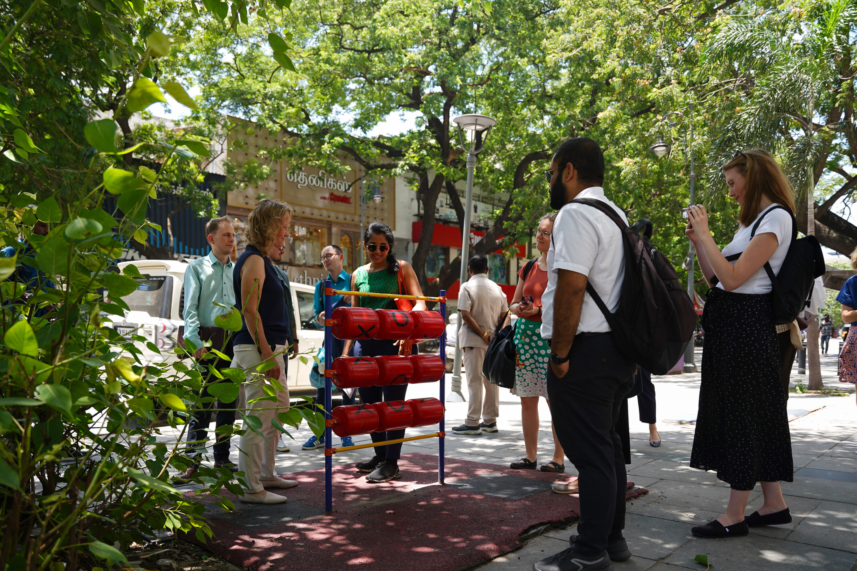 Following the presentation, the Minister and delegation walked with the ITDP India team through the Pondy Bazaar Pedestrian Plaza to experience the project first-hand. Through the visit, the ITDP India team highlighted key successes of the project—the wide and accessible walkways, trees and green areas, comfortable seating, designated parking areas and well-managed on-street parking, children’s play areas, and integrated utilities—making it a unique space in the city, and a role model for other cities.