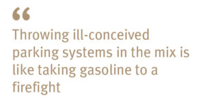 But when you throw ill-conceived parking systems into this mix, it is like taking gasoline to a firefight. The backlash of this self-inflicted problem is found in every nook and corner of our cities, in all sorts of positions (angular, parallel, perpendicular) and scales (on-street, multi-level, automated).