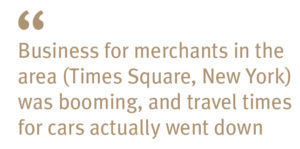 In 2009, Janette Sadik-Khan, the then transportation commissioner of New York City, envisioned Times Square to be a car-free zone. That is, the hub would be less of a conduit for vehicles and an urban space where people could freely walk, sightsee, dine, and take in the magnanimity that is New York. Though there were initial reservations, the results were quite remarkable and by 2010 the changes were made permanent. Citylab reported that “business for merchants in the area was booming, and travel times for cars actually went down”.