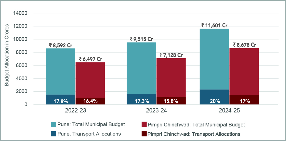 In 2024-25, PMC and PCMC allocated significant portions of their municipal budgets to transport—₹2,320 crore (20% of total budget) for PMC and ₹1,475 crore (17% of total budget) for PCMC.