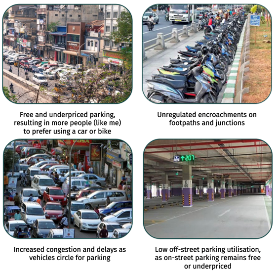 In Chennai, these aren’t just hypothetical scenarios, with a population of 15.37 million and 9.2 million registered vehicles, the Chennai Metropolitan Area (CMA) faces a severe parking crunch as there’s nearly two vehicles for every three people in the city. A driver struggling to park in a narrow lane, while a pedestrian—with an elderly companion or child—undertaking challenging obstacles on a short 500-meter walk, dodging haphazard parking one side and speeding vehicles on another- are common scenes we all encounter.