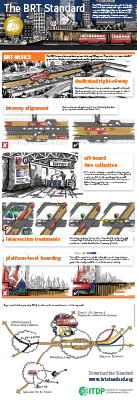 This infographic highlights the key features of BRT essential to any BRT system. These elements ensure that BRT systems have high operating speeds and provide a good customer experience.