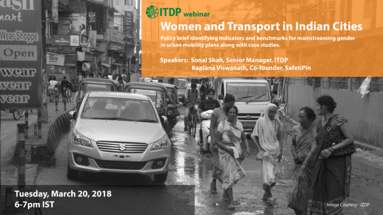 The Institute for Transportation and Development Policy and Safetipin released a first-of-its-kind policy brief on Women and Transport in Indian Cities in 2017. ITDP hosted a webinar on March 20, 2018 to introduce the policy brief and discuss the gendered dimensions of transport and employment in the transport sector in Indian cities. The emphasis was on proposed urban transport indicators and service level benchmarks (SLBs) for comprehensive mobility plans, recommendations to improve women’s modal shares and experiences of walking, cycling, public and intermediate public transport, and engendering public transport authorities. In addition to SLBs and recommendations, the role of ministries and departments in mainstreaming gender was also discussed.