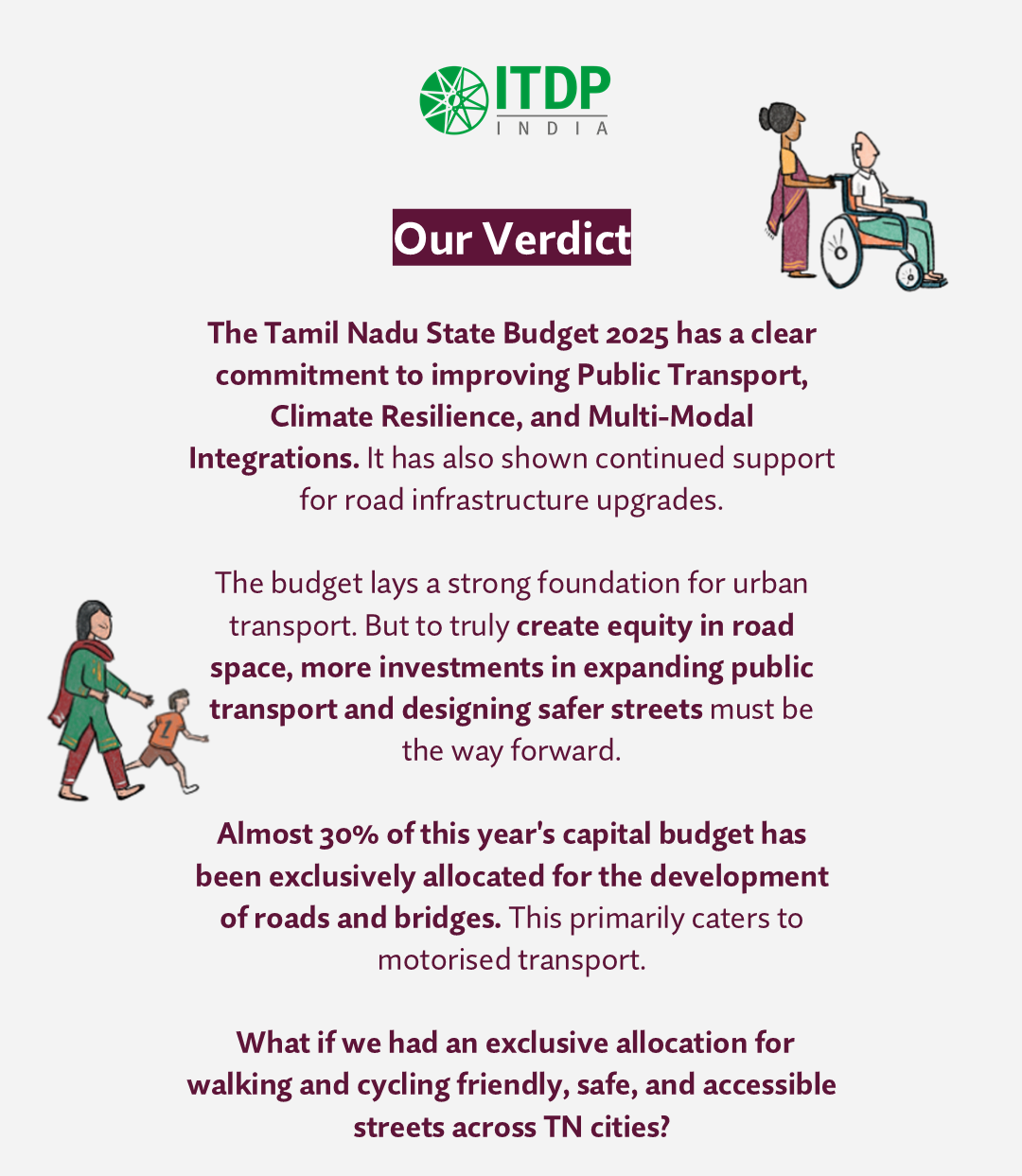We at ITDP India analysed the budget outlay across sectors to understand how much allocations was given for sustainable urban transport and urban development this year. This is a critical exercise to see whether the budgets are in line with the state’s overall commitment to Sustainable Development Goals and its other forward-looking policies like Tamil Nadu EV Policy, city level Non-Motorised Transport Policy and Comprehensive Mobility Plans