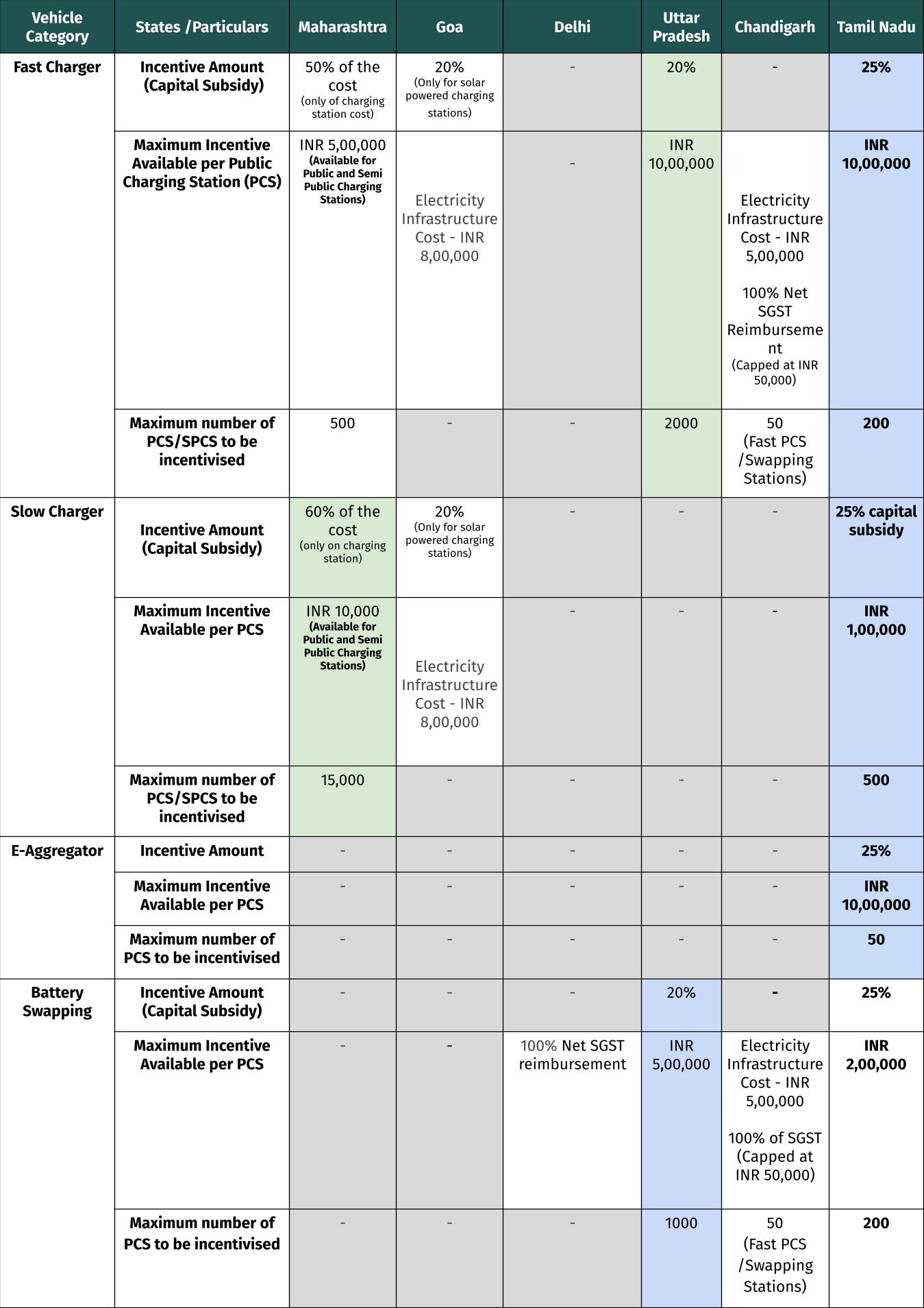 The above comparison shows that Tamil Nadu provides the highest incentives to charging point operators, but the number of beneficiaries is restricted. This low number could reduce the momentum.