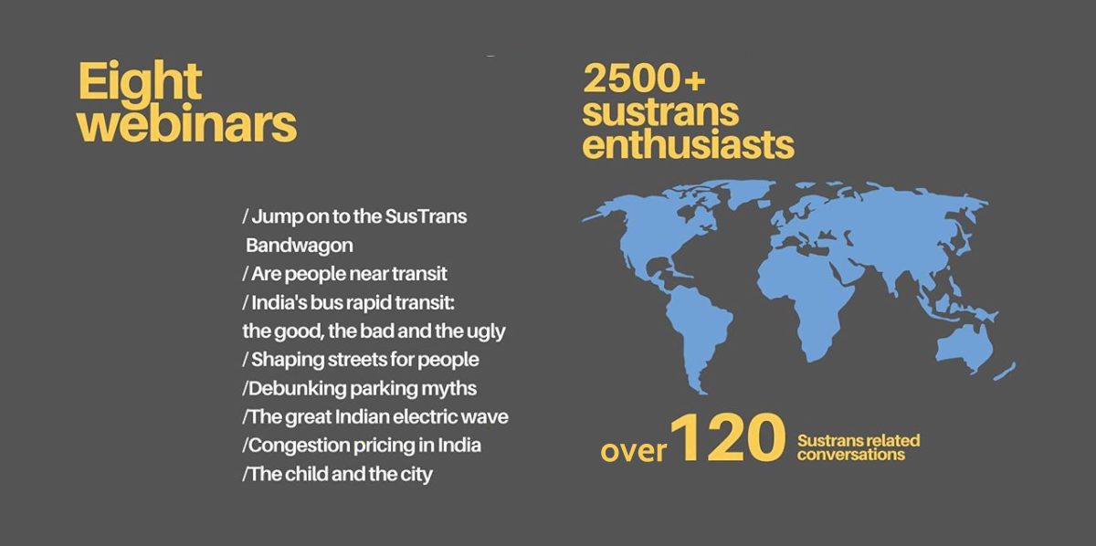 In 2019, we decided to take Urbanlogue digital with the first Urbanlogue webinar series launched in July comprising eight episodes focussed on creating a roadmap to sustainable mobility for India. Urbanlogue Webinars – Series One received great support, reaching an audience of nearly 2500 public officials, professionals, students, and urban enthusiasts across the country.