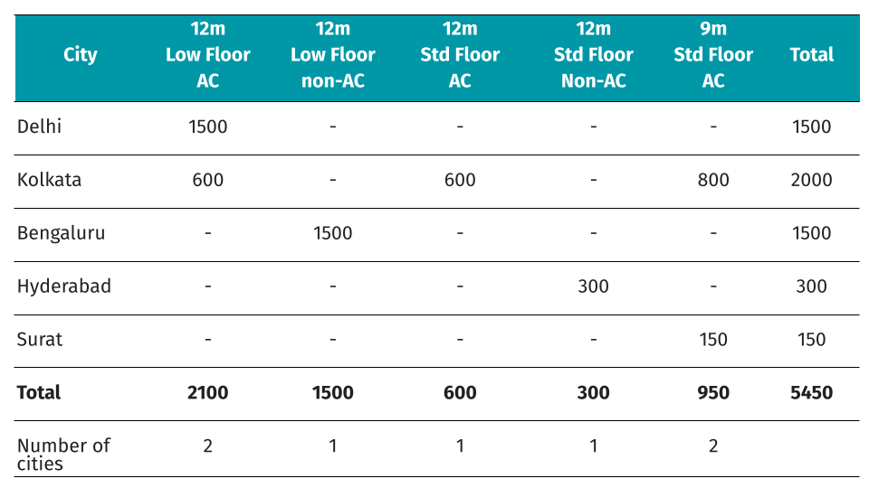 The Convergence Energy Services Limited (CESL) tender for 5,450 e-buses that closed in April 2022, is by far the largest tender for e-buses in India. Through a process called Grand Challenge – I (GC-I), CESL was able to homogenise the contract conditions and aggregate the requirements of five out of nine cities eligible to access the government incentives (Table 1).