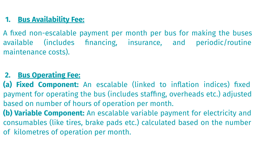 The Bus Availability Fee would primarily depend on the bus specifications and can be homogenised across cities. The Bus Operating Fee can be customised for each city based on local parameters, scale of operations etc.