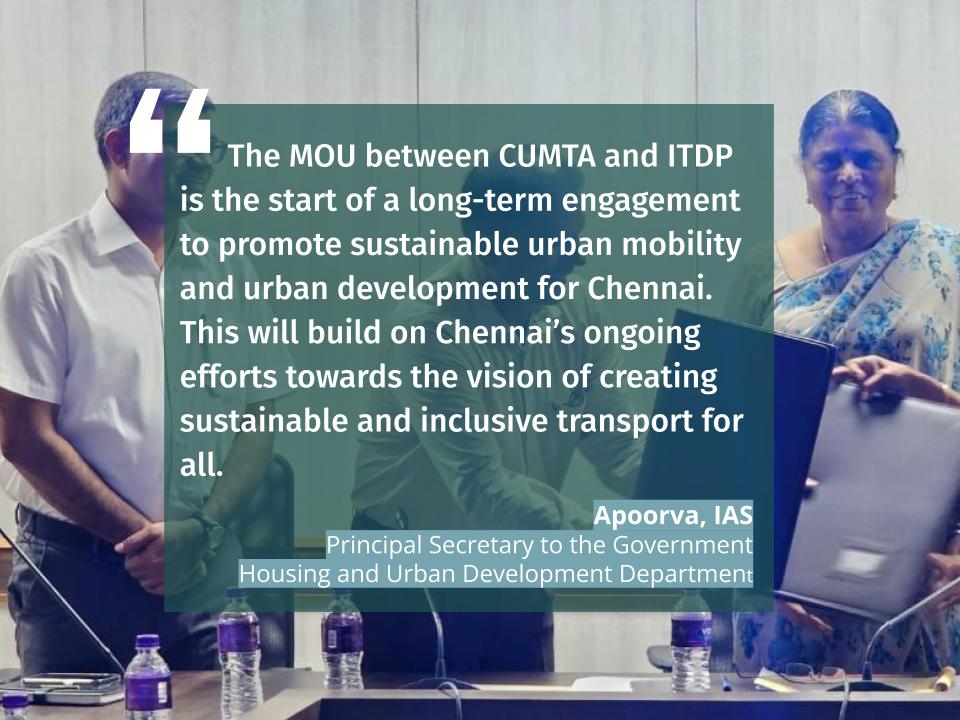 On 16th August 2023, the Chennai Unified Metropolitan Transport Authority (CUMTA) signed a Memorandum of Understanding (MOU) with the Institute for Transportation and Development Policy (ITDP). Mr.Jeyakumar, IRTS, Member Secretary/Special Officer, CUMTA, signed the MOU with Ms.Aswathy Dilip, Managing Director, ITDP India in the presence of Ms.Apoorva, IAS, the Principal Secretary to the Government, Housing and Urban Development Department. Bringing all key agencies and stakeholders related to mobility under a single roof, CUMTA ensures seamless integration and implementation of all transport projects across various modes in Chennai.