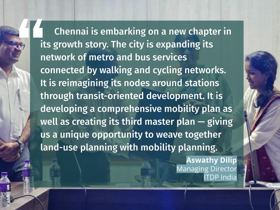 As part of the engagement, ITDP will support CUMTA in embracing an approach of prioritising sustainable mobility—especially ensuring seamless multi-modal integration between various modes of transport; improving road safety of citizens while they use and shift between the various modes; and regulate private vehicle usage through efficient parking management.