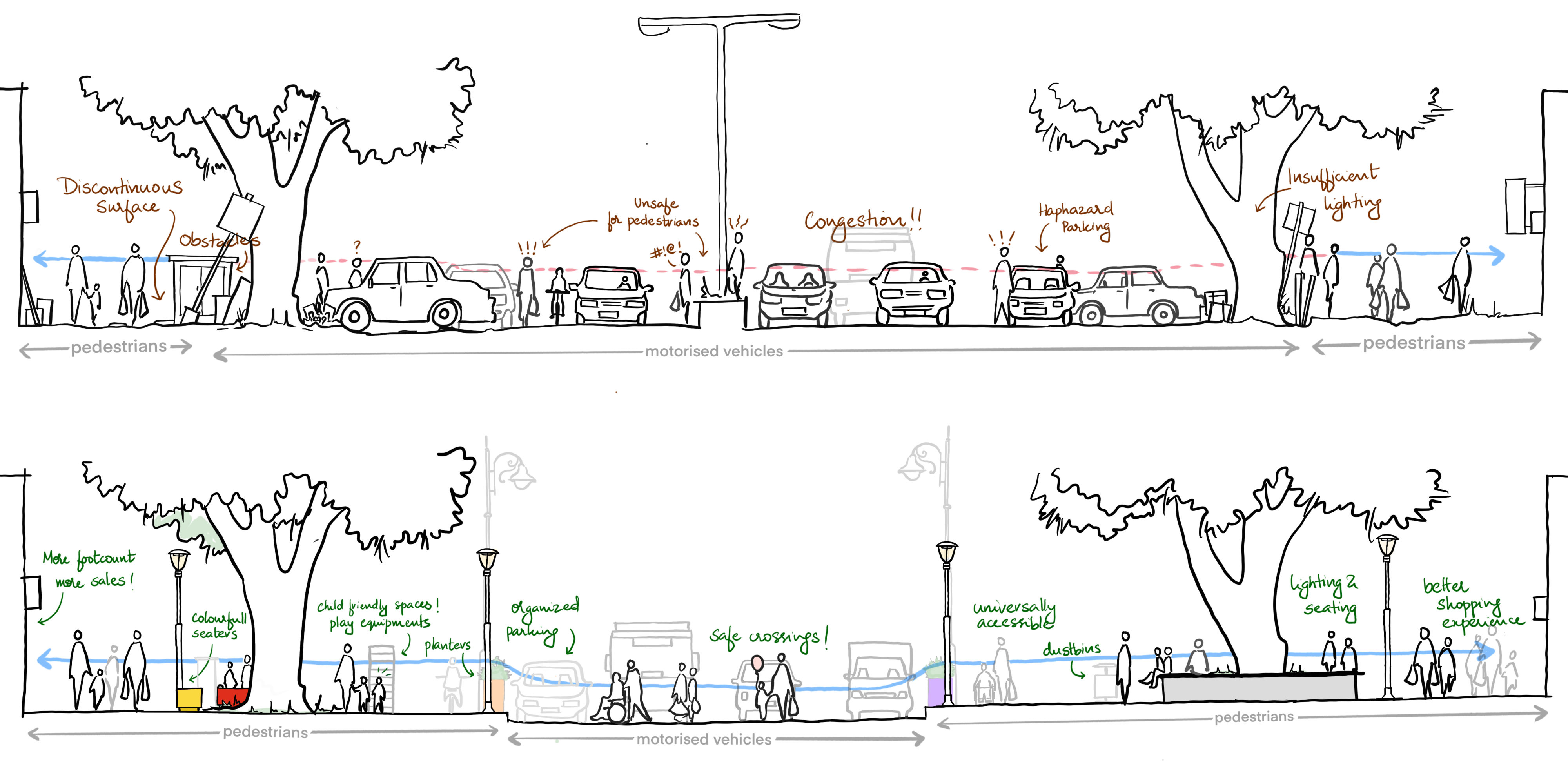 The Pondy Bazaar Pedestrian Plaza, one of Greater Chennai Corporation’s most anticipated projects, was launched with much pomp and show on the 13th November, 2019, by the Hon. Chief Minister of Tamil Nadu, Thiru Edappadi K. Palaniswami. Spanning over 700m on Sir Thyagaraya Road, the plaza has successfully transformed one of Chennai’s busiest and car-centric shopping streets into a pedestrian promenade by prioritising people over vehicles, and opening up new ways of experiencing the space. With wide and safe pedestrian walkways on both sides, ample shaded seating, beautiful landscape, and colourful play elements, the plaza was designed as a space accessible for all, including women, children, senior citizens and people with disabilities.