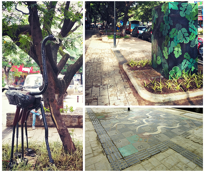 The numerous existing trees that line the stretch have been fundamentally incorporated in the design, with care taken to demarcate soft areas around them to allow for growth, and the perimeter forming seating. In addition, benches have also been provided along the footpath, complementing the shops and making the stretch more vibrant. Art installations, including the attractive casing that has been used to cover up the junction boxes, spruce up the space. Other features such as life-sized snake & ladder boards on the footpath further augment the character of DP Road.