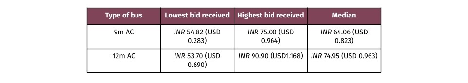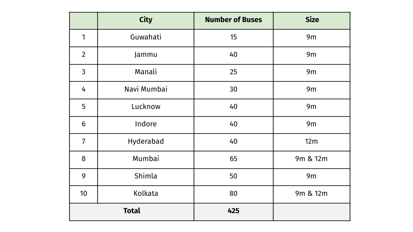 For a city to be selected, it needed to meet two criteria—one was that the state had an Electric Vehicle policy; and two, it had a provision to waive the registration charges and road taxes for electric vehicles. FAME-II also mandated procuring buses through a ‘Gross Cost Contract’ (GCC). Under FAME-II, DHI offers a maximum demand incentive of INR 55 lakhs (USD 71k) per bus for 10-12m buses, INR 45 Lakhs (USD 58k) for 8-10m buses, and INR 35 Lakhs (USD 45k) for 6-8m buses.