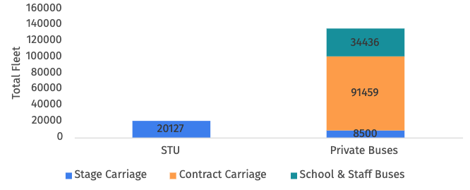 Buses are the backbone of Tamil Nadu’s urban mobility. There is a total of 28,500 stage carriage buses (private and government operated). These are the buses which run on fixed routes, stop to pick up and drop off passengers, and charge per head. Of these 28,500 stage carriage buses, 30%, i.e 8,600 odd are privately owned. Of these, only 7,500 buses are currently operational on the road every day.