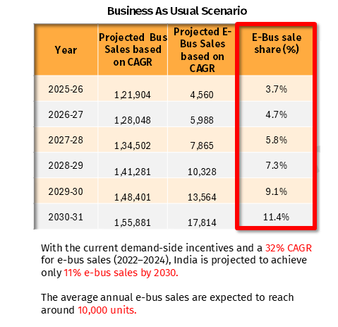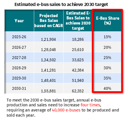 This approach is crucial for India, where the current manufacturing capacity of electric buses is significantly below the required levels to meet the EV30@30 targets. Sales must increase by atleast four times.