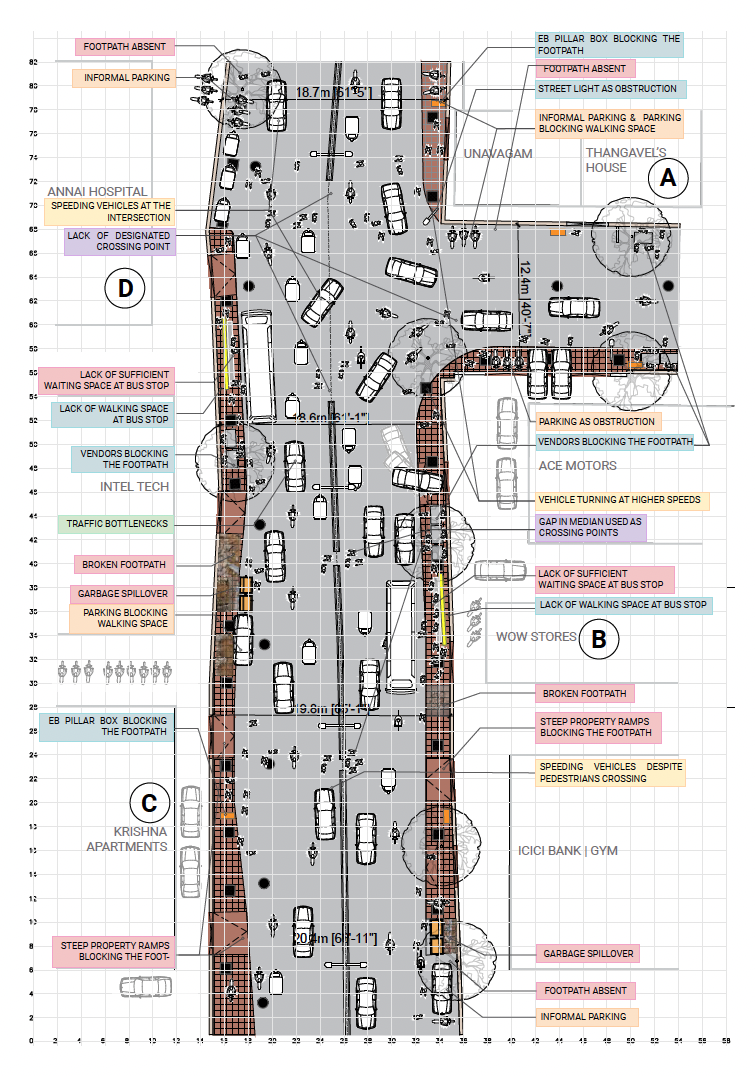 We started by creating a fictional street, Malgudi Salai (Malgudi Street, in Tamil) and developed a plan view of an 80m stretch of this street, on the playing board. To keep it as realistic as possible, we depicted broken footpaths, varying carriageway widths, parking encroachments, large intersections, etc. on the playing board. Common pedestrian issues were also identified on the board to make it easier for the participants to understand the context and resolve them through design.