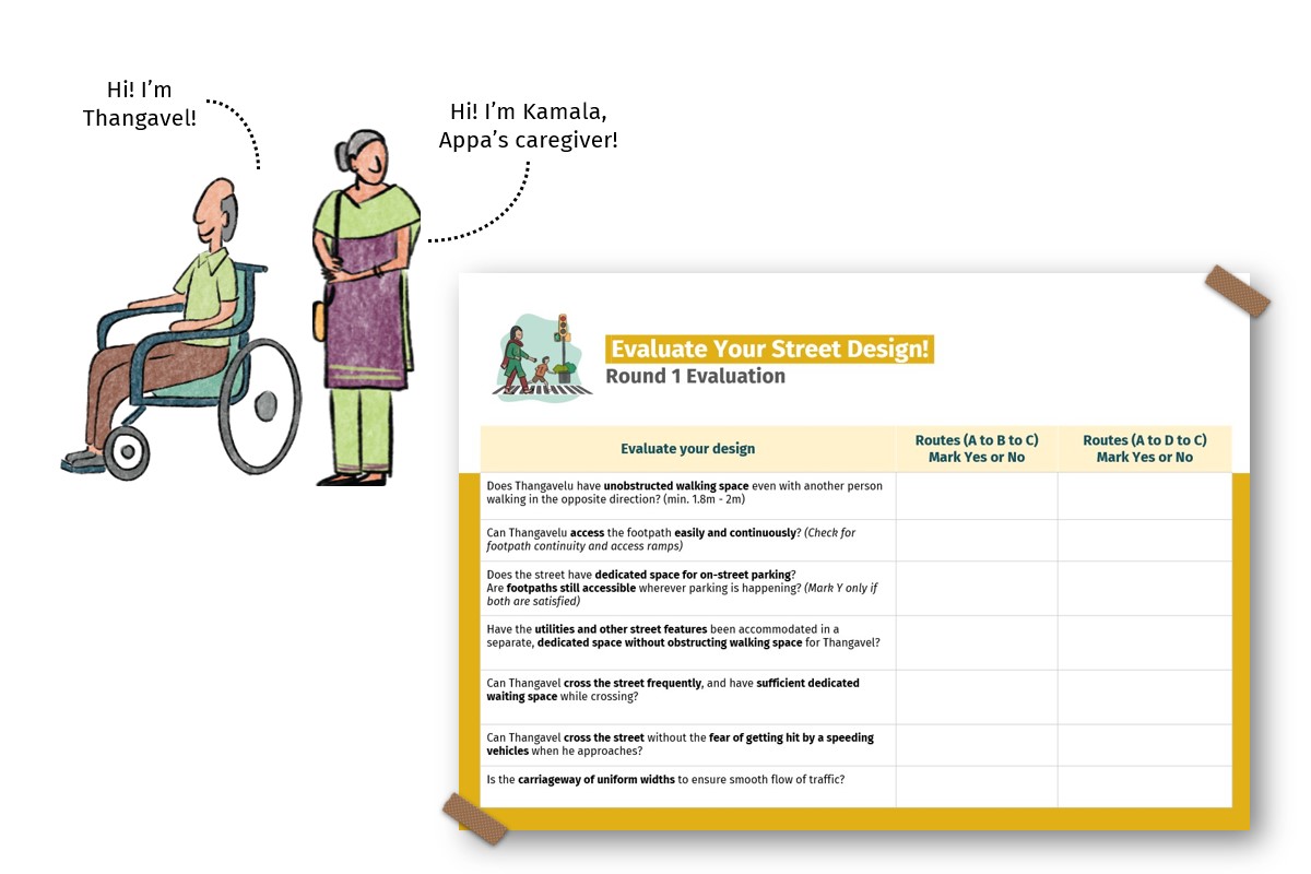 To make the game more engaging, we introduced two fictional pedestrian characters—Thangavel, a person with disability, and Kamala, a caregiver—who frequently used Malgudi Salai. Through their journey, we highlighted specific street issues, such as Thangavel struggling to navigate a broken footpath with his wheelchair. These scenarios helped participants understand the street issues from the characters’ perspectives. We shared an evaluation matrix which helped the teams evaluate their designs, keeping in mind the needs of Thangavel and Kamala. The evaluation matrix was a set of questions to check if a particular street design element was designed correctly.